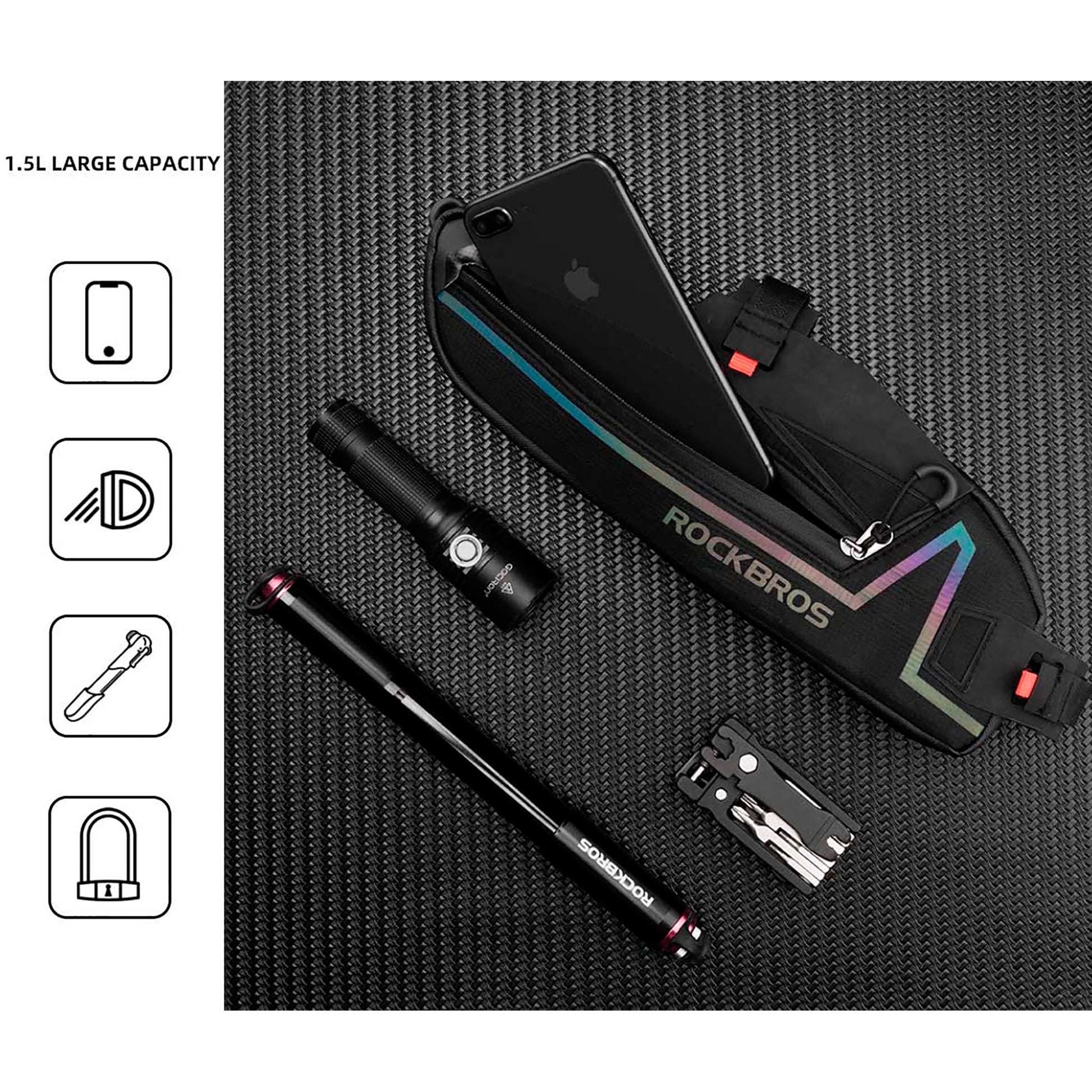 Capacidad: 1,5 L. A prueba de agua, no es 100% impermeable pero puede aliviar la entrada de lluvia efectivamente. Detalles reflectantes para la noche. Material resistente al desgaste. Las almohadillas antideslizantes de bolsa hacen que la instalción sea más firme. Material: TELA + PU. Peso 118 g APROX. Dimensiones: 31 x 10,5 x 5 cm APROX. Color: NEGRO.