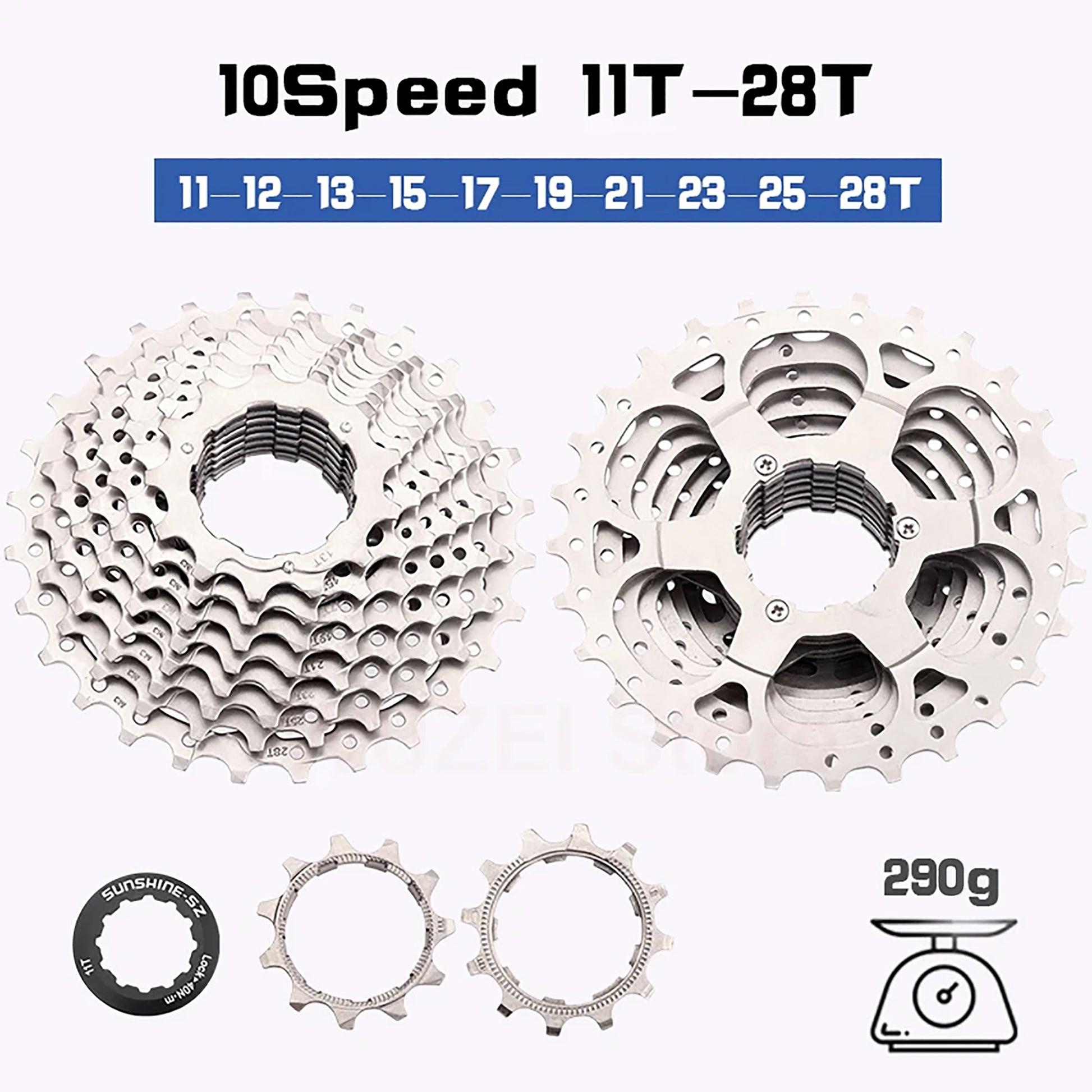Número de Velocidades: 10. Piñón más Pequeño: 11T. Piñón más Grande: 28T. Tipo de Bicicleta Compatible: Carretera. Material: ACERO de alta resistencia. Compatible con: SHIMANO, SRAM, SENSAH, LTWOO, MICROSHIFT y otros kits de cambio de carretera (debe ser base de buje de cassette de estilo japonés). Peso: 290 g APROX. Color: PLATA.