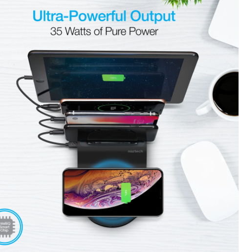Carga en simultaneo hasta 5 duspositivos. Diseño elegante. Construcción con material premium. Sálida: 35 Vatios - 7A. Puertos: 3x USB A, 1x USB C. Cárga inalámbrica rápida: 10W. Color: NEGRO.