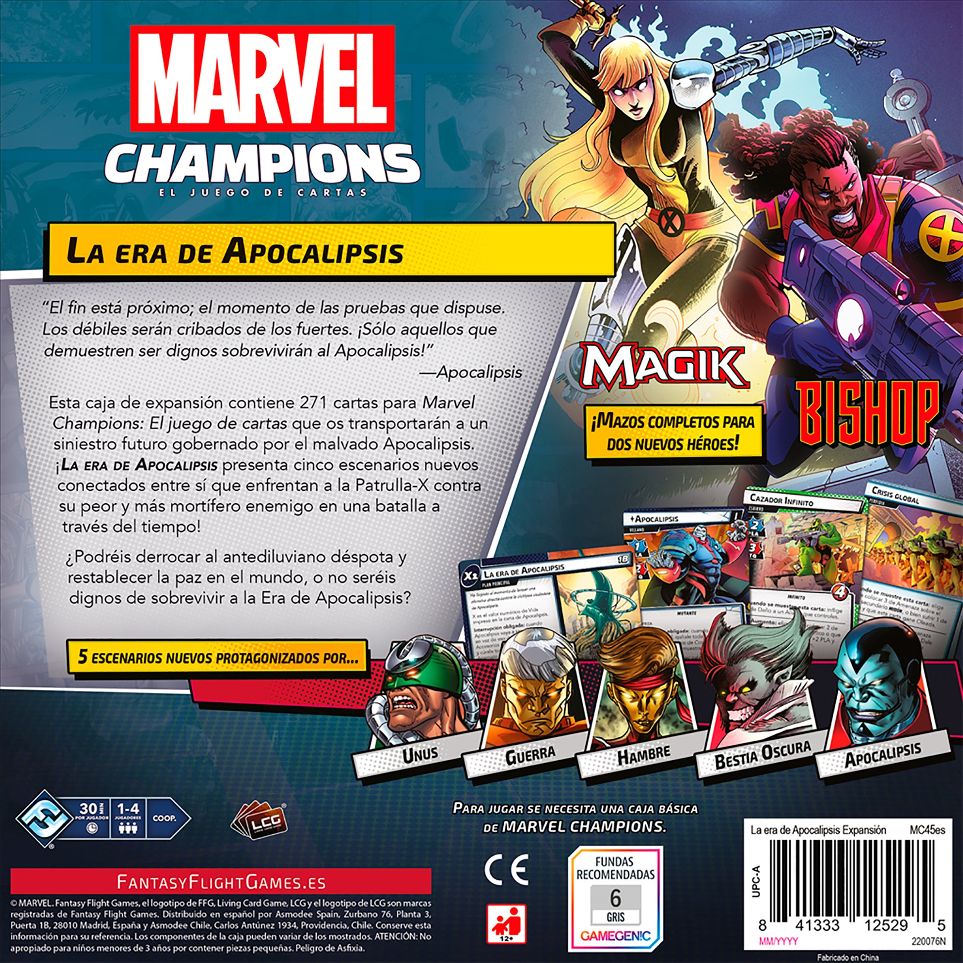 Bienvenidos a la conclusión de la 'trilogía mutante' de expansiones para Marvel Champions: El Juego de Cartas! Como séptima expansión de campaña del juego, La Era del Apocalipsis trae varios personajes clásicos de los X-Men, incluyendo dos nuevos héroes jugables, Bishop y Magik, cada uno con un mazo preconstruido listo para jugar desde el principio. Enfréntate a las fuerzas de Apocalipsis, el mayor y más poderoso enemigo de los X-Men. Esta expansión incluye cinco escenarios completamente nuevos, cada uno de los cuales puede jugarse individualmente o como parte de una campaña más amplia.