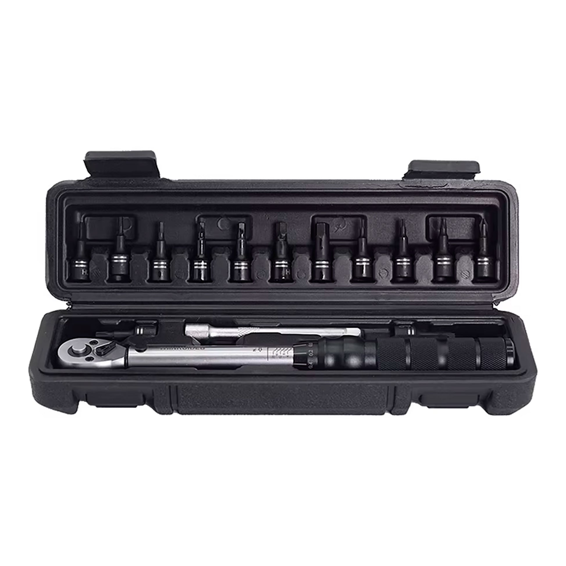 Juego de llave torque de 1/4'' con puntas Torx y Allen, ideal para mantenimiento de bicicletas de ruta y montaña. Permite cambiar entre izquierda y derecha. Botón de liberación rápida. Escala láser galbanizada, clara y fácil de leer. Mango antideslizante texturizado para un agarre firme y mayor comodidad.