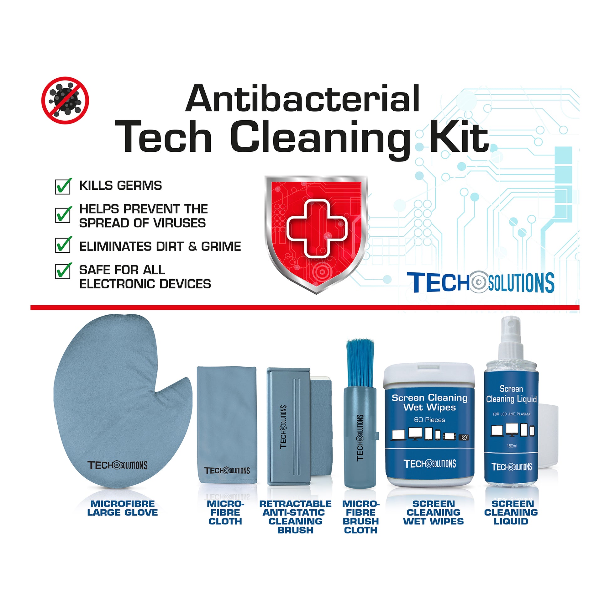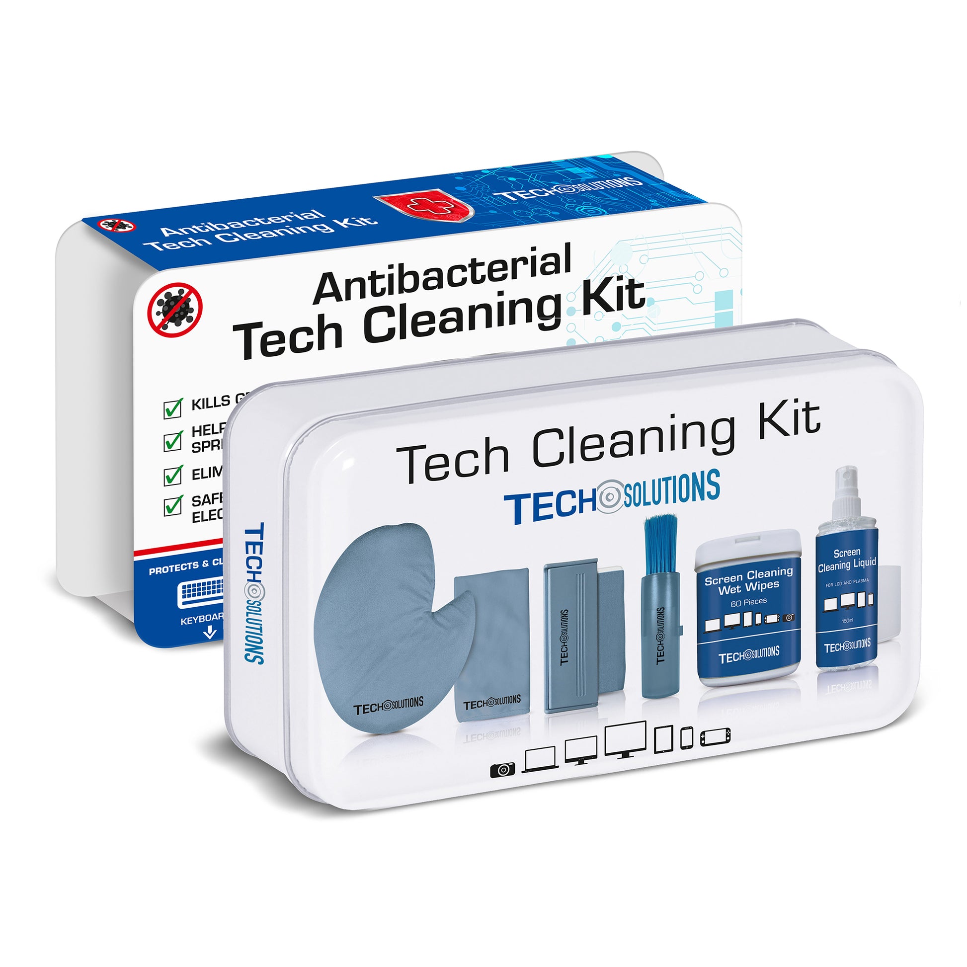 Kit de Limpieza Antibacterial compuesto por: Guante de microfibra. Cepillo de limpieza de microfibra. Cepillo de limpieza antiestático retráctil. Paño de microfibra. Toallitas húmedas para limpieza. Solución de limpieza para pantallas. Caja de almacenamiento de metal.