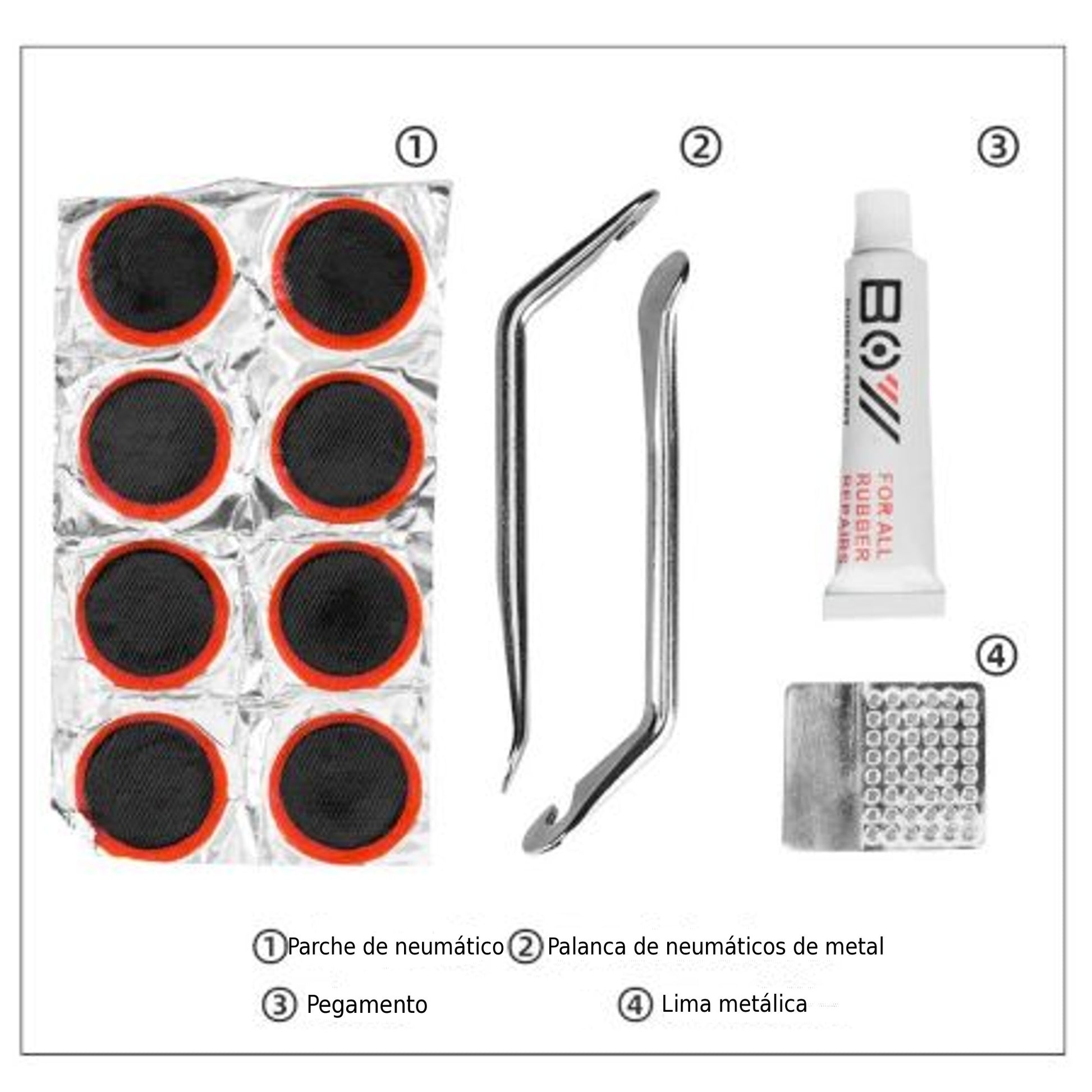 Peso: 87gr APROX. Tamaño: 130 x 55 x 18 mm APROX. Incluye: Instrucciones, lija, pegamento, 8 parches, 2 palancas de llantas.