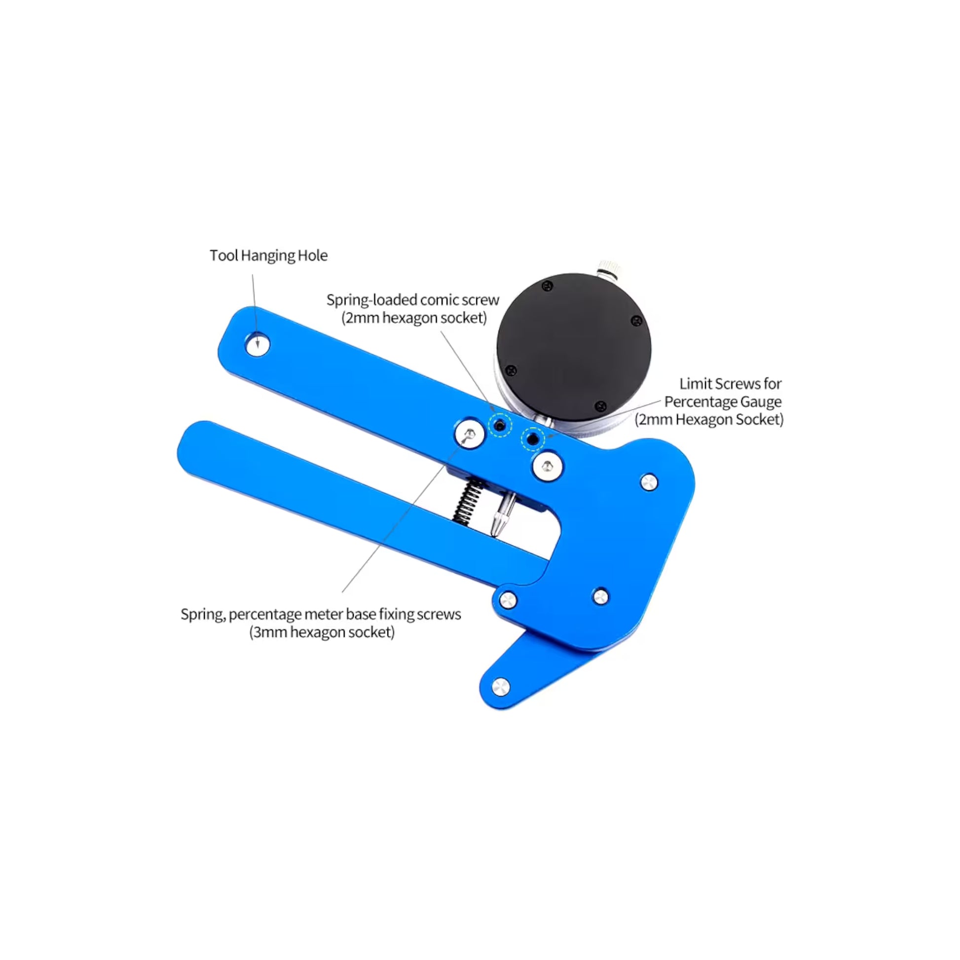 Medidor de tensión digital. Incluye herramienta para tensar rayos. Material: Aleación de aluminio. Dimensiones: 210 x 200 x 80 mm APROX. Peso: 513g APROX. Color: AZUL.