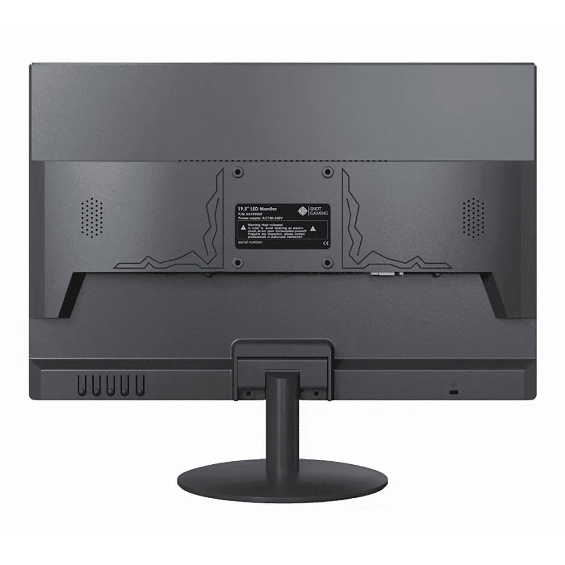 SHOT GAMING - MONITOR GAMING PLANO SG195E05 Pantalla: 19,5'' VA LED, HD+ (1600 x 900 píxeles). Relación de Aspecto: 16:9. Frecuencia de Actualización: 60 Hz. Tiempo de Respuesta: 5 ms. Brillo: 250 cd/m2. Colores: 16,7 M. Puertos: HDMI x 1, VGA x 1. Alimentación: CA 100 - 260 V. Reclinable. Montaje Vesa: 75 x 75 mm. Color: NEGRO.