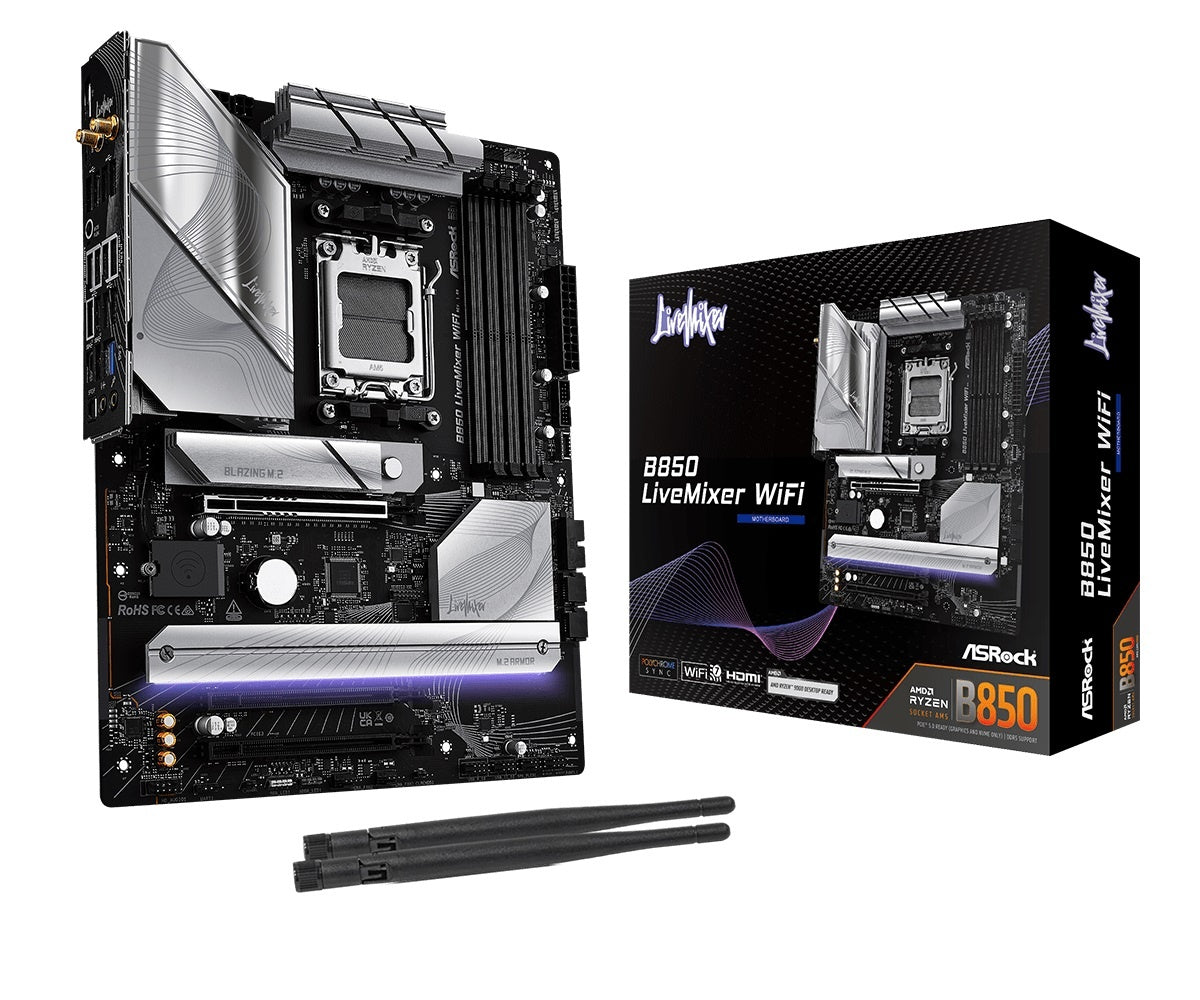 Formato: ATX Compatibilidad: Ryzen Series 7000, 8000 y 9000 Socket AMD AM5 Chipset: AMD B850 Memoria: DDR5 (Dual channel) hasta 256GB Almacenamiento: 1 x Blazing M.2, 2 x Hyper M.2, 1 x M.2 y 4 x SATA de (6 Gb/s) Graficos: AMD RDNA Audio: Realtek High Definition 7.1 integrado PCIe 4.0 X16 - 3.0 X1 Conector RGB Conector de alimentacion: ATX de 24 pines Módulo WiFi 802.11axe Wi-Fi 6E Incluye 2 Antenas ASRock WiFi 2.4/5/6 GHz