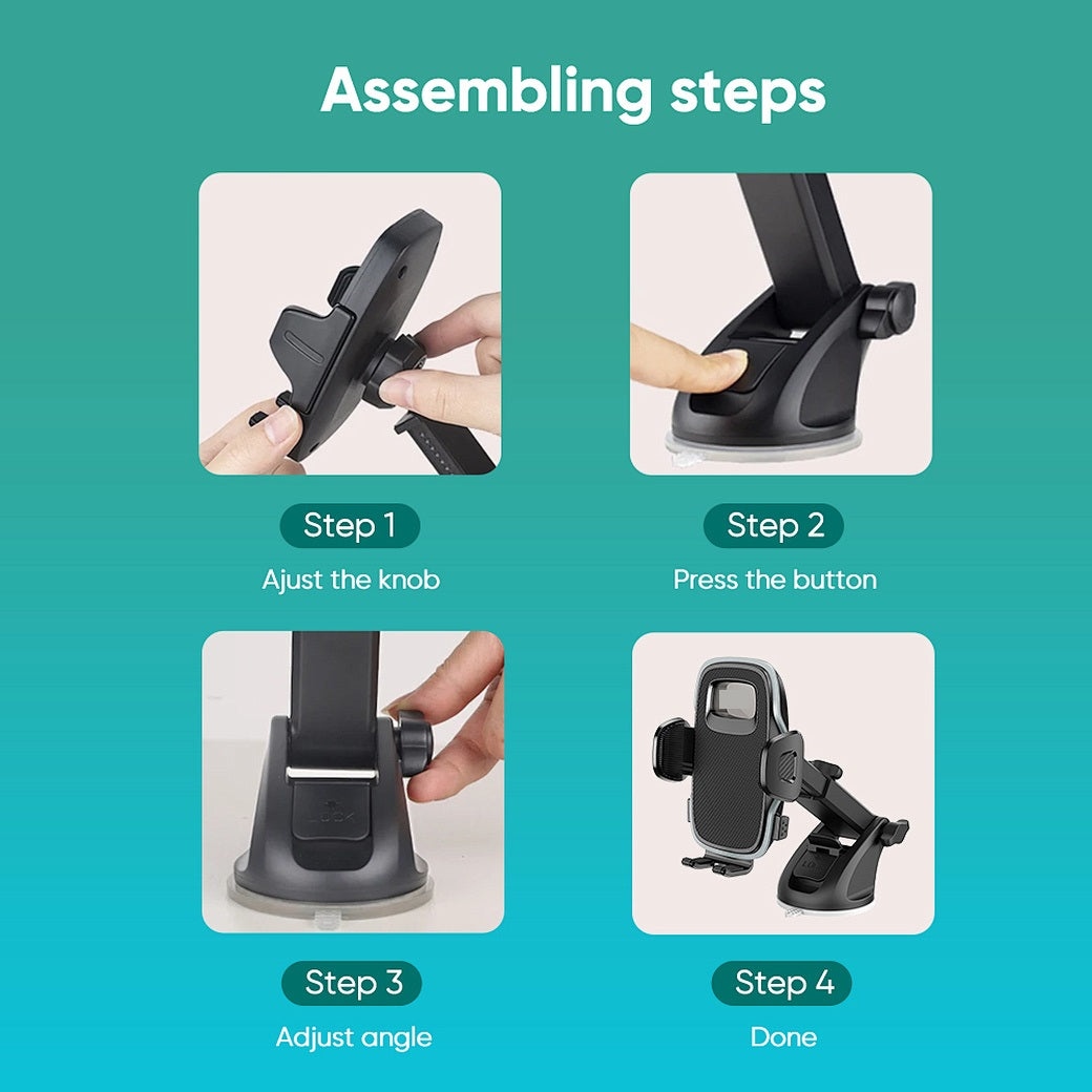 Instalación Fácil: El soporte se monta fácilmente en el tablero o parabrisas de tu coche, ofreciendo una instalación rápida y segura que no requiere herramientas ni adhesivos.